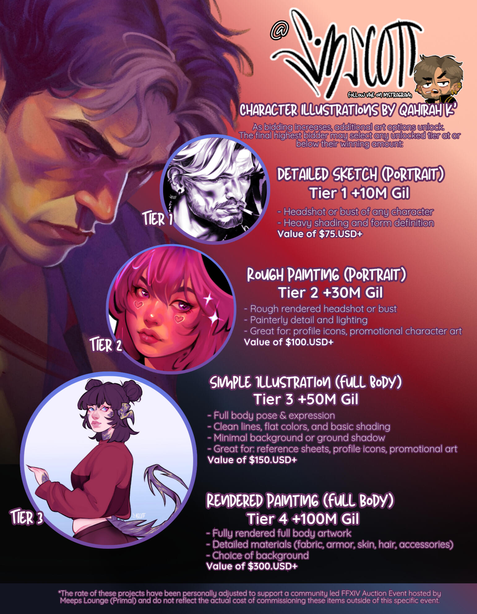 Due to the high USD value of my commissions, I do not have an accurate cost for in-game currency.A black and white character sketch begins at $100 USD, or about 125mil gil. I will occasionally do giveaways, discounts, and auctions in-game to support friends at a lower gil value however these prices do not accurately reflect commission pricing.For a more precise quote, please contact me with detailed project specifications.